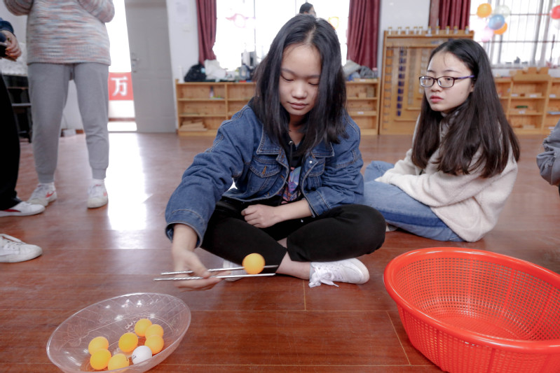 素拓活动分为三个项目——“坐地起身”、‘筷’运乒乓”和“不倒森林”。游戏“坐地起身”中,在不用手撑地、只能借助同伴的力量的情况下同时站起来才算挑战成功,参赛队伍成员间每一次的默契起身赢得了观赛人员的阵阵喝彩,现场的气氛瞬间活跃起来。在实验室进行的是“‘筷’运乒乓”的游戏,队伍的成员轮番上阵,聚精会神地用筷子将一个个乒乓球运往另一个盆子,又“快”又“准”的操作调动着在旁观赛人员紧张的心情。游戏“不倒森林”将活动推向高潮,队伍成员跟着口令绕圈接杆,一放一接足见同伴间的完美配合。