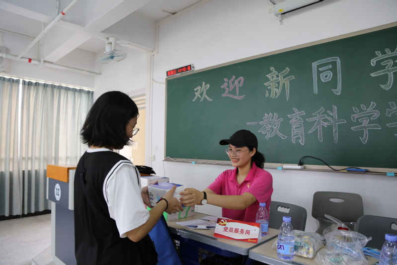 在这次迎新活动中,教育科学学院党总支以积极的服务态度和饱满的工作热情,为新生的报道提供便利的服务。“党员服务岗”为新生服务不仅展现了学院党员良好的精神面貌,还彰显了学院党员创优争先、全心全意为新生服务的精神。