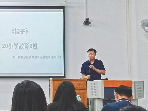 其中,1班的第二组代表罗镕同学对比分析组员的模拟课堂,展示同课异构的课程设计,指出模拟名师课堂的实践性和适用性不足,向大家抛出如何把名师技法应用到实际课堂的疑问,引发了大家的思考和讨论。针对罗镕同学的问题,张铮老师解答说模拟课堂较多聚焦于教学设计的实践与教学技能的锻炼,是为了让同学们在实践中积累经验,为正式走上讲台做好准备。金艳老师也提醒同学们要懂得应用所学心理学的专业知识,如运用《儿童发展心理学》的儿童心理知识,研究学生心理,有助于应对实际课堂的各种情况。两位老师的解答让许多同学豁然开朗并有所启发。