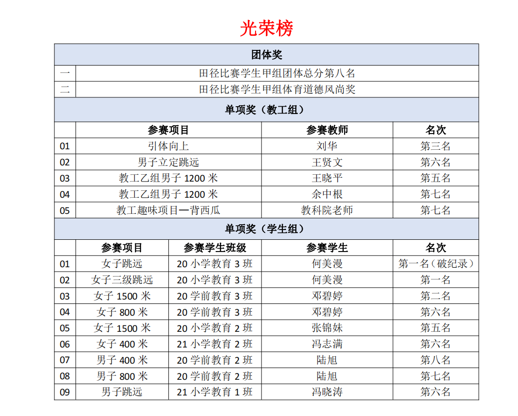 在本次运动会上,我院运动健儿们奋力拼搏,取得了学生甲组总分全校第八名和体育道德风尚奖的良好成绩。其中,20级小学教育3班何美漫同学不仅取得了女子三级跳远第一名的成绩,在跳远比赛中更以4.74米出色的成绩再破学校记录;20级学前教育3班邓碧婷荣获女子1500米第二名以及女子800米第六名。党总支书记谢伟强表示:“非常满意这次教科院的整体表现,也取得教科院历史以来最好的成绩,作为一个年轻的学院,非常不容易。希望我们下一届运动会能比这一届运动会取得更好的成绩!”