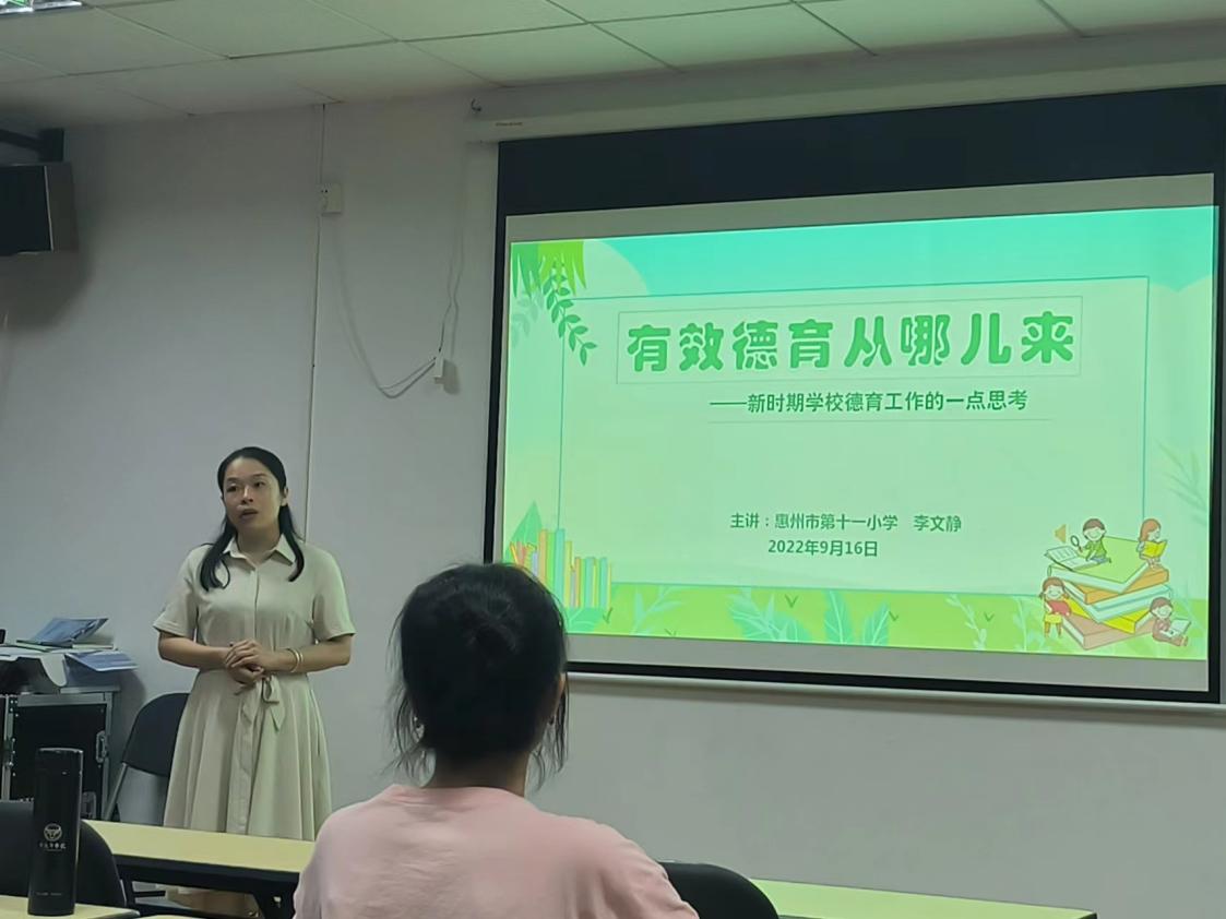 9月16日,惠州市第十一小学李文静校长应邀在旭日大楼614课室为教科院小学教育专业“致远班”学员开展题为“有效德育从哪儿来——新时期德育工作的一点思考”的专题讲座。小学教育专业“致远班”全体成员及部分20级小学教育专业同学参加了此次讲座。