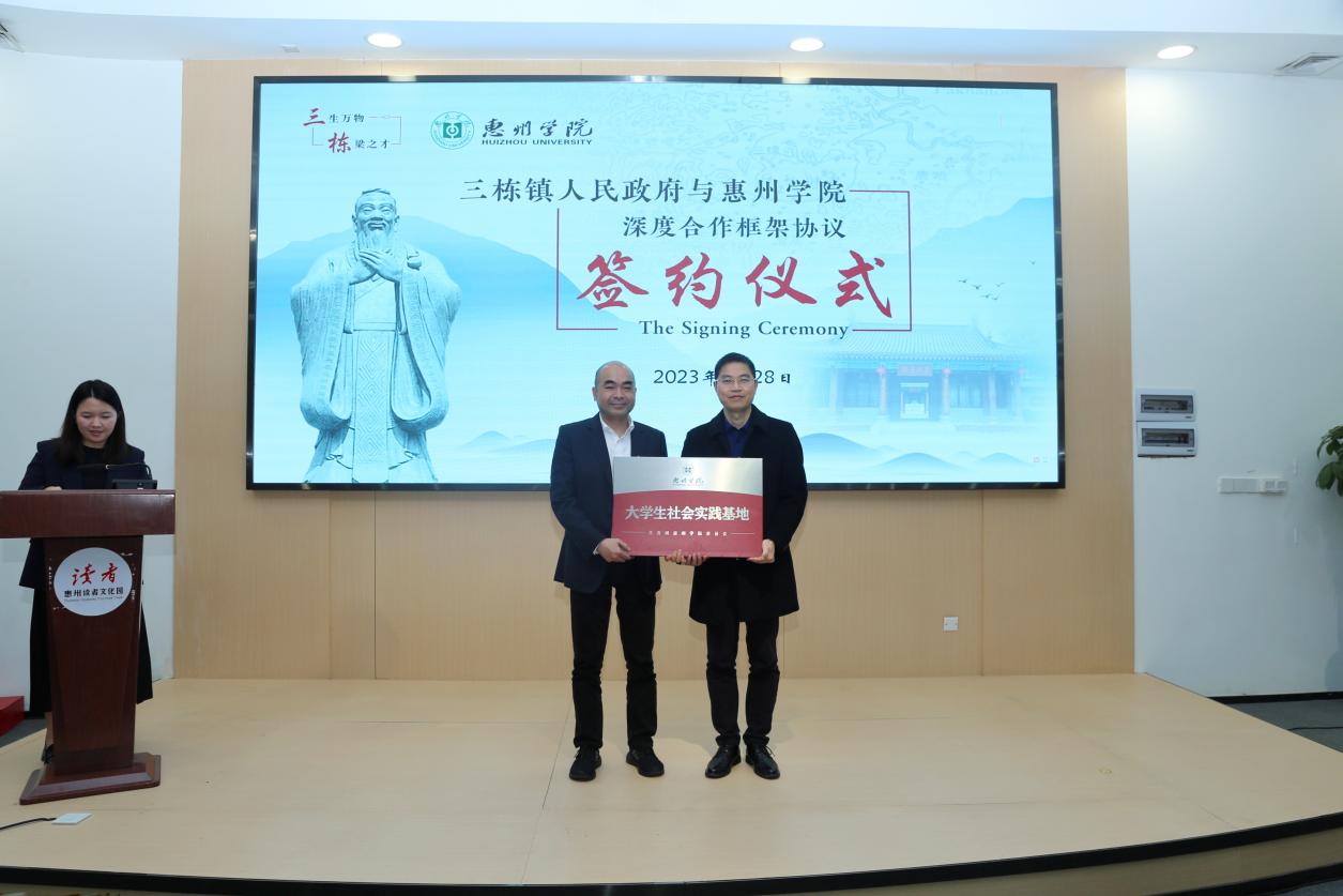 为深入开展“党建+业务”——党旗护航,引领和推动教育科学学院各项事业的发展,3月28日下午,惠州学院与三栋镇人民政府深度合作框架协议签约仪式在三栋镇读者文化园举行。副校长郑文、科研处、教务处、继续教育学院、团委、教育科学院等部门负责人以及三栋镇党委书记李坤民、镇长朱炯、人大主席余向晖等党政领导出席仪式。会上,副校长郑文代表惠州学院与三栋镇政府签订了《惠州市惠城区三栋镇人民政府与惠州学院深度合作框架协议》,教育科学学院陈伟院长与三栋镇政府签订了《三栋镇教育高质量发展的研究与实践》横向科研项目合同,团委书记赖昭华向三栋镇颁发“惠州学院大学生社会实践基地”牌匾。