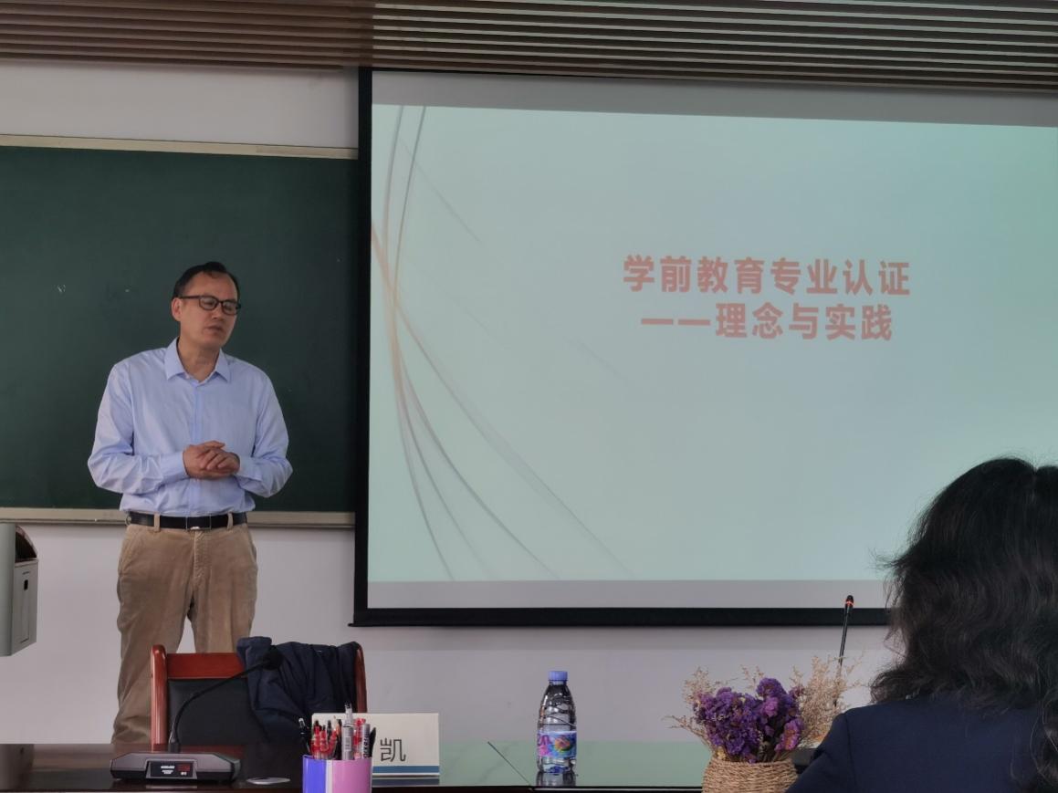 为了促进学前教育专业高质量发展,推进学前教育专业认证工作有序开展,4月6日上午,教科院在旭日楼621召开第二次专题培训指导会。本次会议邀请了广东第二师范学院学前教育学院院长郭凯教授为学院全体教师作关于“学前教育专业认证——理念与实践”的报告。会议由教育科学学院院长陈伟教授主持。
