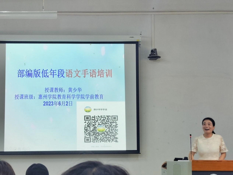 课堂初始,黄老师向同学们简单介绍了有关手语的发展历程,而后带领同学们一起学习《日月明》这首识字歌的手语动作,让同学们初步感知手语学习的乐趣。紧接着,黄老师向同学们呈现了多义字的不同手语,同学们不禁感叹,熟练掌握手语进行交流并不是一件容易的事情。随后,黄老师用一小节歌曲进行手语展示,并邀请同学们进行改编,让同学们了解如何将手语与学前教育专业进行结合。此外,黄老师为同学们讲解了有关听觉障碍的相关知识,并介绍了惠州市特殊学校关于听障儿童的培养目标、课程设置、后期学习安排和就业安排,同学们对于听障儿童的教育也有了更进一步的了解。