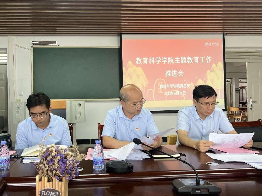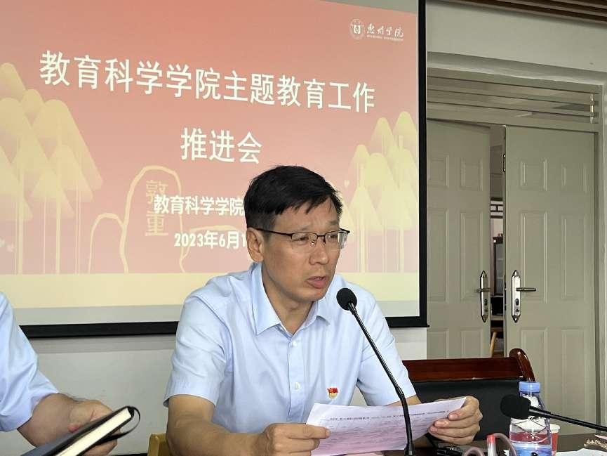 为深入学习贯彻习近平总书记关于主题教育的系列重要讲话和重要指示批示精神,总结前一阶段主题教育开展情况,并围绕推动教育科学学院主题教育调查研究工作举措走深走实,6月15日,教育科学学院召开主题教育调查研究工作推进会。惠州学院副校长郑文和教育科学学院全体教工党员参加了会议。会议由教工党支部书记胡娇主持。