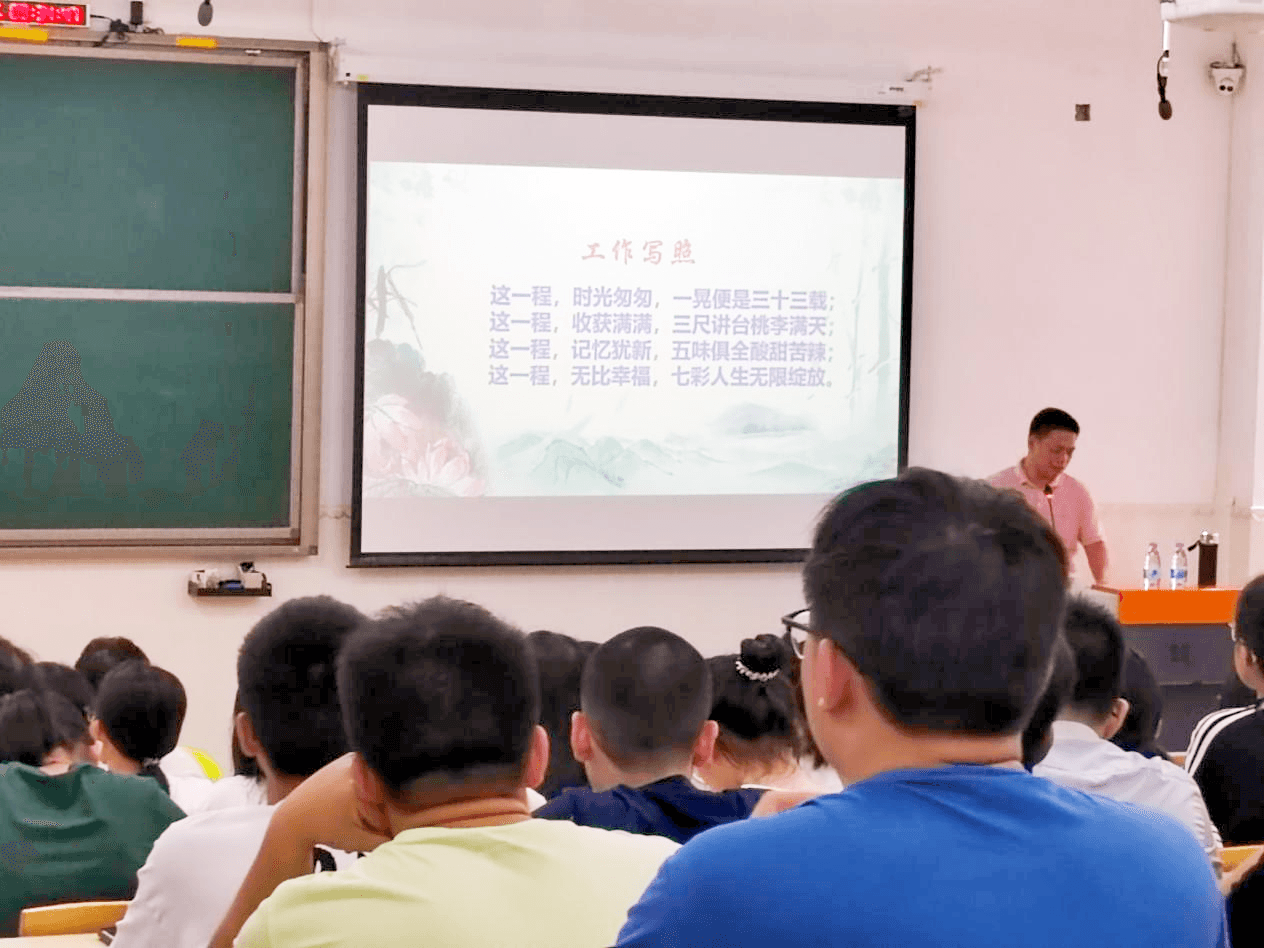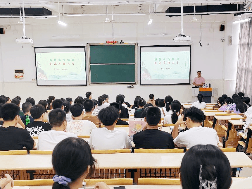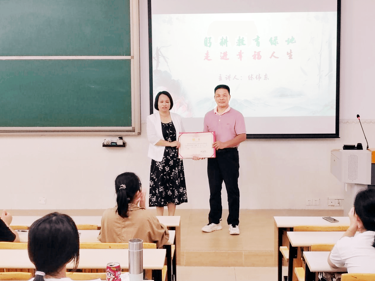 惠州学院兼职副教授练伟东以《躬耕教育绿地,走进幸福人生》为题,从自我介绍、我的教育故事、我的教育感悟三个方面来讲述他的幸福人生。练老师着重讲了在他长达33年教育生涯中的教育感悟,以“教育不是牺牲、而是享受,教育不是重复、而是创造;“善良没有智慧,人生又苦又累”;“善良又有智慧”三句人生信条来启迪新生以后可以在享受教育中创造美好人生。所谓“道阻且长”,他把他的教育阶段分为四个阶段,且每个阶段都躬耕教坛,过得有滋有味。他对新生抱有殷切希望,希望新生能够在他的经验中有所启发,认真学习好专业知识,规划好大学四年的生活,为成为一名教育工作者打下坚实基础。