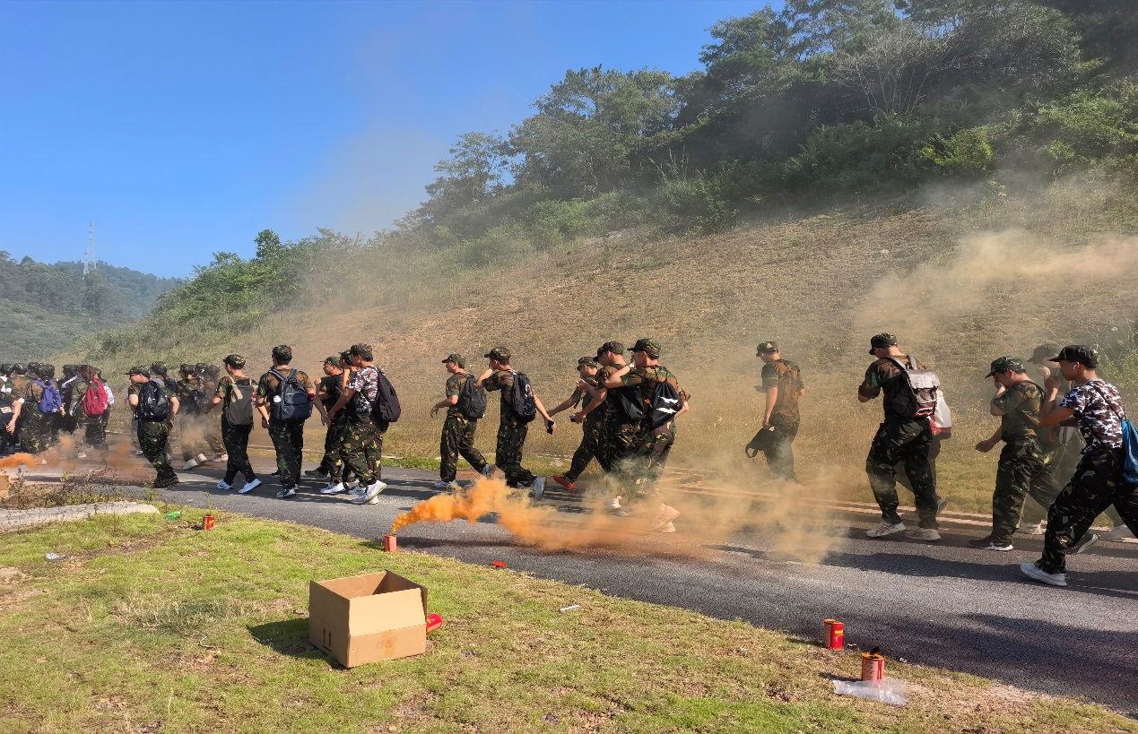 身着迷彩服的同学们个个意气风发,依次走过“急行军”、“丛林穿越”、等路段,面对烟雾区域冷静应对、有条不紊、迅速穿越,展现出参训学子的应有素养。行进过程中各连队互相加油打气,唱着军歌、喊着口号,同学们一步一个脚印铿锵前行,最终用自己的毅力和勇气赢得了属于自己的凯旋。