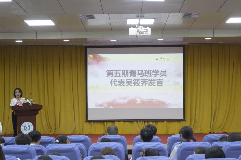 第四期青马班学员黄文婧同学作为优秀代表发言,她在发言中提到:青马班是一个独特的学习平台,它能够让我们深入马克思理论,理解历史和社会,同时也锻炼了我们思维和批判性思考能力,使我们具备更浓厚的家国情怀。随后第五期青马班学员吴筱荠作为新一期学生代表发言,她表示青马班是以马克思主义思想为指导,培养青年人的责任感和担当精神的重要平台,在接下来的日子里,学员们将会努力学习马克思主义理论知识、积极参与社会实践活动、加强自我修养,为实现中华民族伟大复兴贡献出自己的力量。作为学生干部,也要积极帮助同学,关心集体,以实际行动践行社会主义核心价值观。