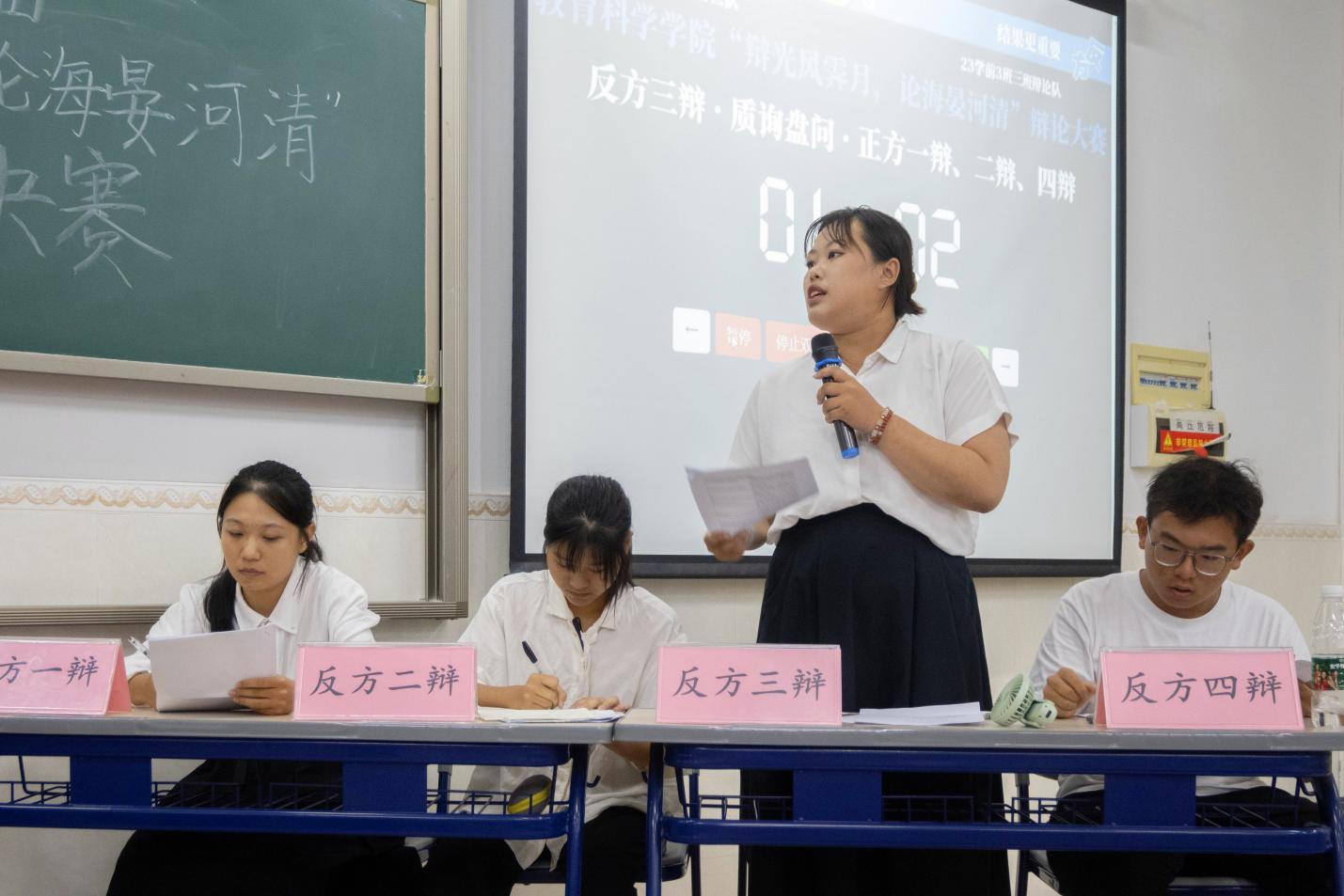 为发挥校园文化育人功能,丰富教育科学学院学子课余生活,提供锻炼自己、发挥才能的机会,2023年10月24日,教育科学学院第一届“辩光风霁月,论海晏河清”辩论大赛决赛于科技楼B座306举行。本次决赛由辅导员老师及院辩论队成员担任评委。