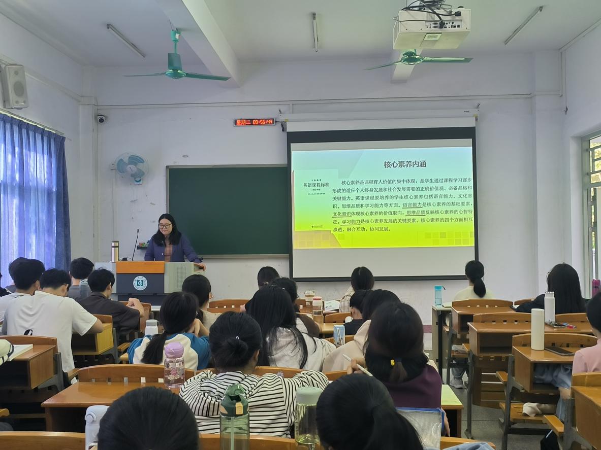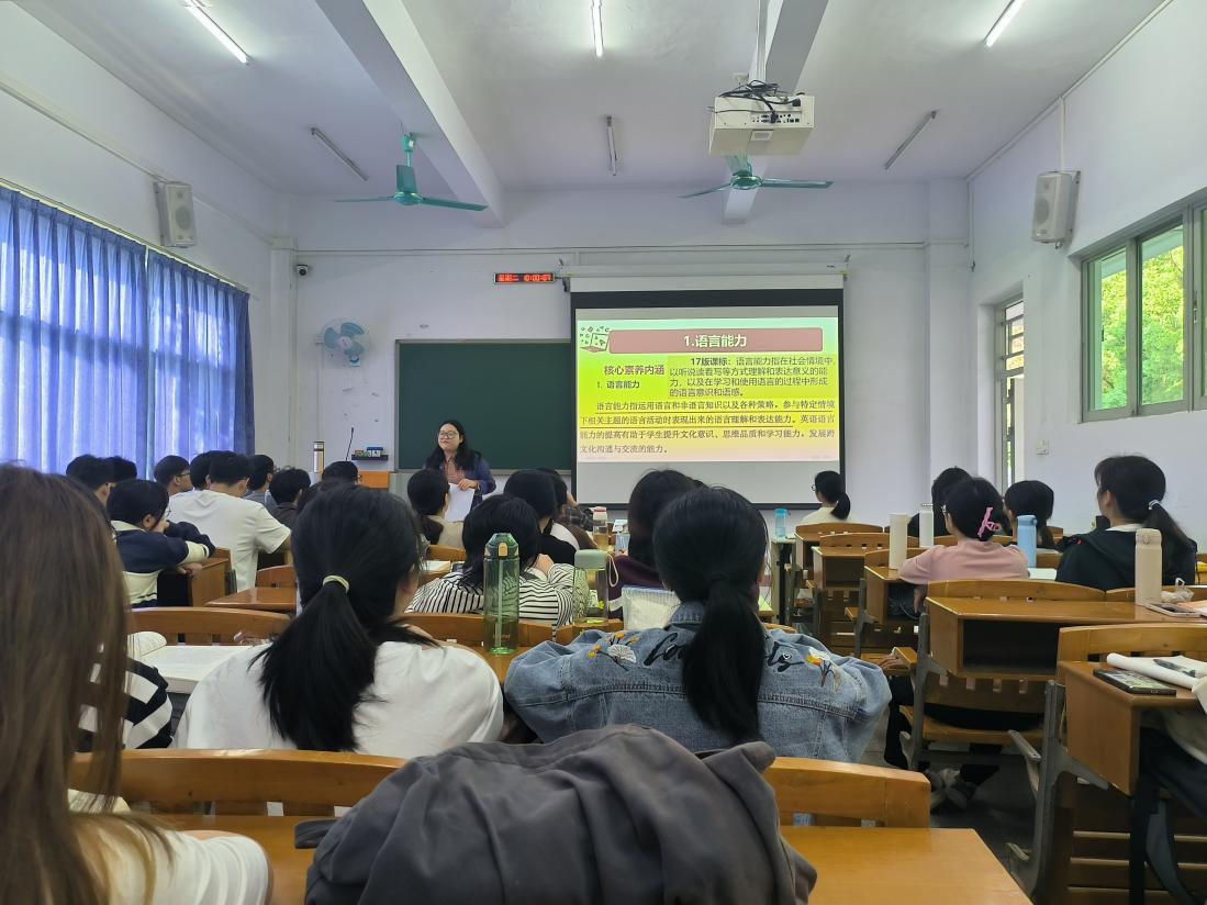 接着,张铮老师讲解核心素养中的语言能力。张老师先出示语言能力的内涵,并与17版课标语言能力的内涵相比较,让同学们深刻把握新课标语言能力的内涵,最后用考题检验学生对核心素养语言能力的理解。然后,张铮老师讲解了核心素养中的文化意识。张铮老师先出示了文化意识的内涵,再用教材举例,挖掘教材中体现的文化意识。