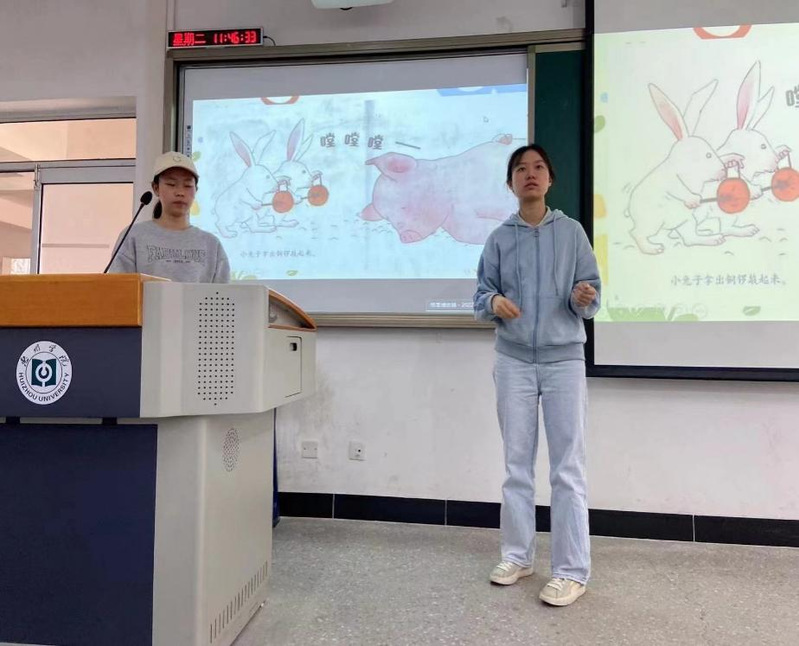 其实第一次义教我还是很紧张的,几晚都没有睡好觉,夸张的是连做梦的时候我都会梦到自己义教的样子。在李老师面前试讲的时候我还是很紧张,我能感觉到自己有些拘束,有些放不开,但我已经尽力让自己再夸张一点,再大胆一点。绘本故事讲完之后,李老师既给了我莫大的鼓励,也给了我十分实用的建议。我觉得自己还是需要再多多参加此类活动的,在实践中锻炼自己。