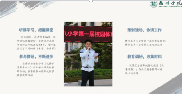 首先,来自实习学校龙门县龙城第三小学的孙丽菲、博罗县第八小学的黄健、惠州市中建麦绍棠学校的殷小婷、博罗县园洲第二中心小学的陈伊帆、惠东县第八小学的朱庭斌、大亚湾京师实习学校的万颖芳、博罗会横河天行小学的李怀旭、博罗县罗阳第四小学的邓洁和广州增城区华南师范大学附属新塘学校的王育彬9名同学作为实习生代表,向大家讲述了他们在实习过程中通过不断学习和虚心请教,提升了自己的课堂教学能力和班级管理能力。同时,他们分享了自己在实习过程中所遇到的困惑和挫折,以及如何通过与指导老师、同学的交流和合作,克服困难,提高自己的专业素养和教育教学能力。