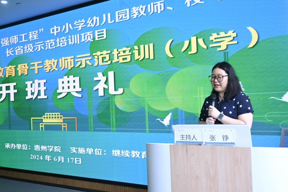 2024年6月17日上午,由广东省教育厅主办,惠州学院承办的“新强师工程”中小学幼儿园教师、校(园)长省级示范培训项目之中小学劳动教育骨干教师示范培训(小学)在惠州学院旭日科技大楼A座13楼智慧教室1304正式开班。德赢vwin8868官网副院长金艳副教授、小学教育系主任张铮老师、副主任卢萌老师以及来自全省的学员们出席了开班仪式。仪式由德赢vwin8868官网张铮老师主持。
