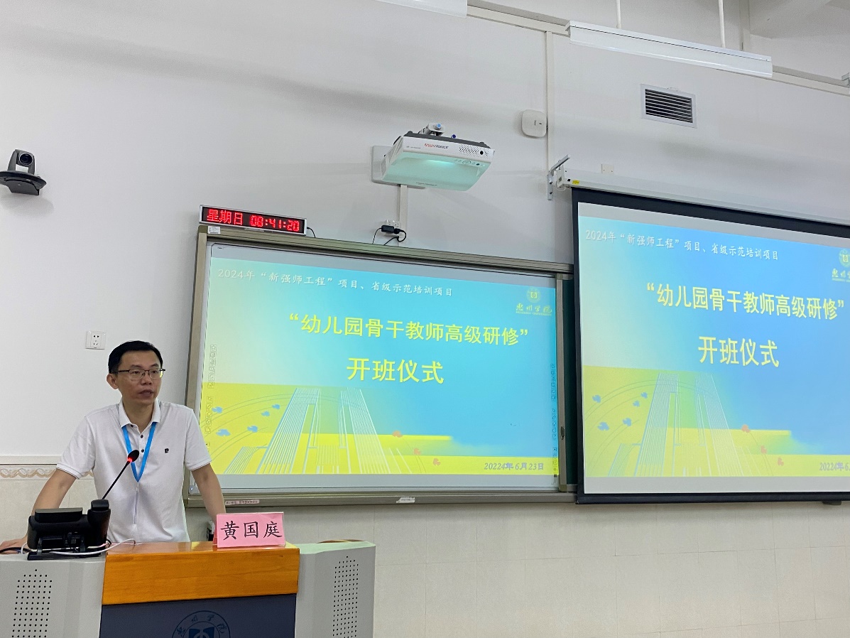 2024年6月23日上午,广东省2024年新强师工程中小学幼儿园教师、校(园)长省级示范项目之幼儿园骨干教师高级研修(惠州学院班)在旭日科技大楼B座202举行开班典礼。该高级研修班由德赢vwin8868官网承办,该学院党委书记谢伟强、学前教育系黄国庭主任以及来自全省各地市的50位幼儿园骨干教师参加了开班仪式。仪式由教育科学学院教师麦日岸主持。