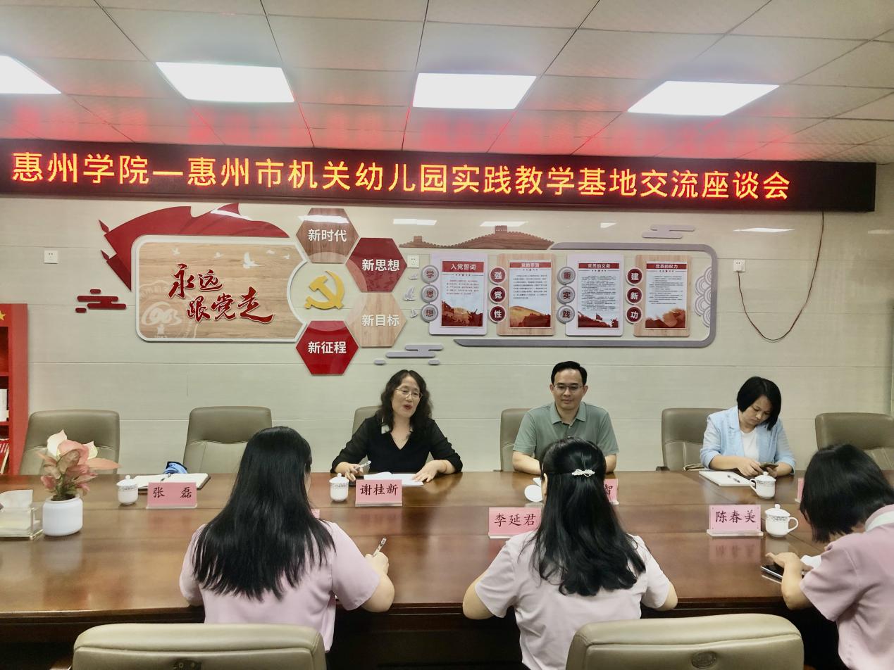 本次主要走访了惠州市机关幼儿园,市机关幼儿园党支部书记、园长李延君,专职副书记袁巧巧、副园长陈春美参加了座谈交流。座谈会上,以OBE为理念,以师范类专业认证为抓手,依据人才培养方案,就实践教学基地双方协同合作的主要内容进行深入探讨。双方在进一步落实人才培养方案、提高人才培养质量、规范学生实习实训管理、促进教研合作等方面进行深入座谈,重点沟通校园合作情况,以及教育见习、教育实习等协同育人内容,期望以本科教育教学审核评估、师范专业认证工作为契机,进一步促进学校在实习管理制度、校园文化建设等工作的推进与完善。