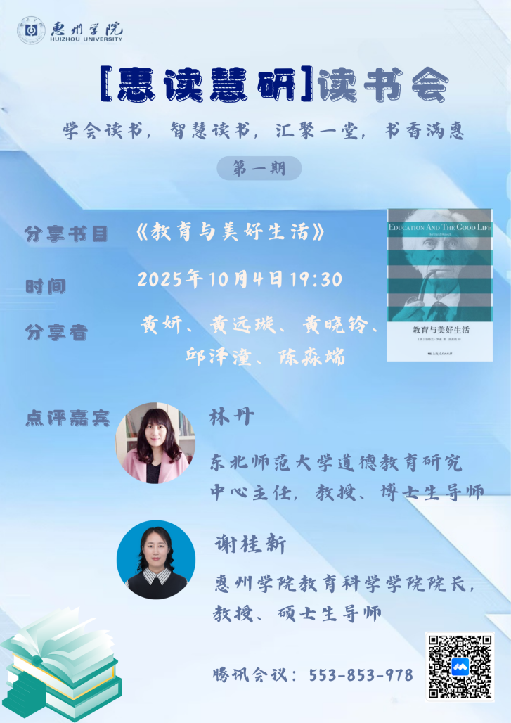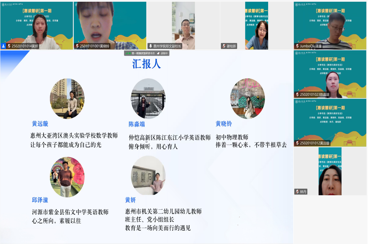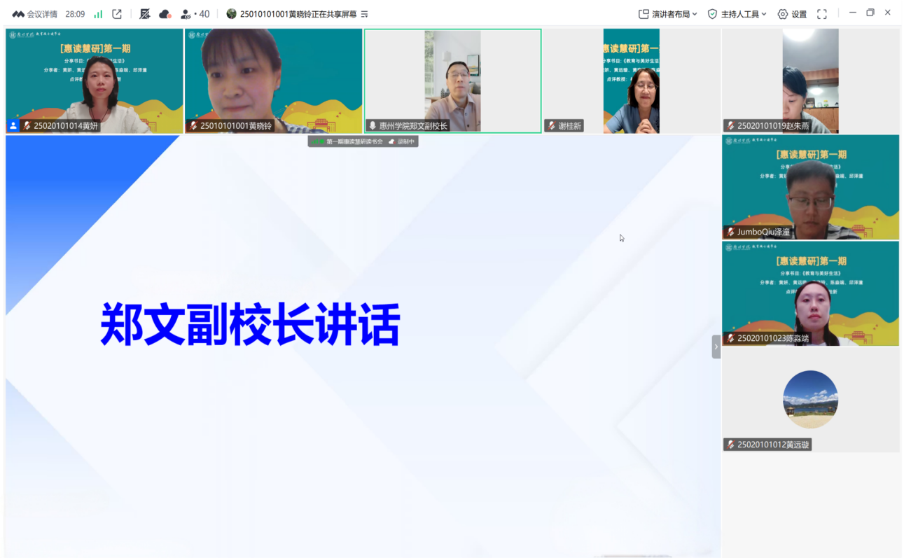 为夯实研究生理论功底、拓展学术视野、促进知识交流、提升学术水平,教育科学学院决定举办“惠读慧研”读书会。该读书会旨在让学生学会读书,智慧读书,实现汇聚一堂,书香满惠。2025年10月4日晚19点30分,首期“惠读慧研”读书会在线上腾迅会议举行。读书会邀请到副校长郑文教授,东北师范大学道德教育研究中心主任林丹教授、教育科学学院院长谢桂新教授,2025级教育硕士、研究生导师,学前教育、小学教育卓越班同学及相关人员积极参与。