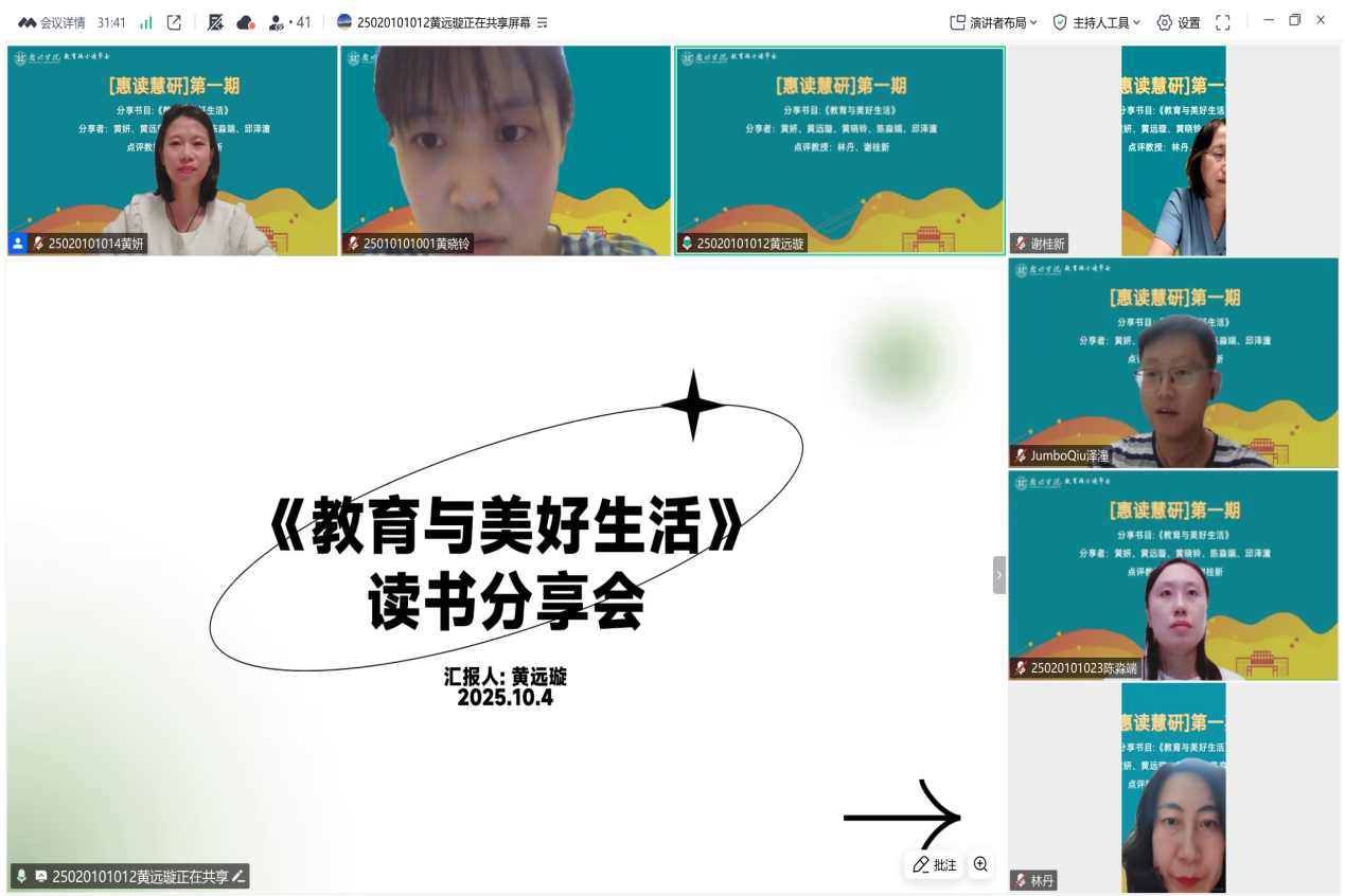 学生黄远璇、陈淼端、黄晓铃、邱泽潼、黄晓铃、黄妍结合自己所学所思,分别对《教育与美好生活》这本书进行了阅读分享,引发同学们的热烈讨论,最后,嘉宾林丹教授对每个学生的观点进行了点评,谢桂新教授从读书会活动及学员分享进行了整体点评。